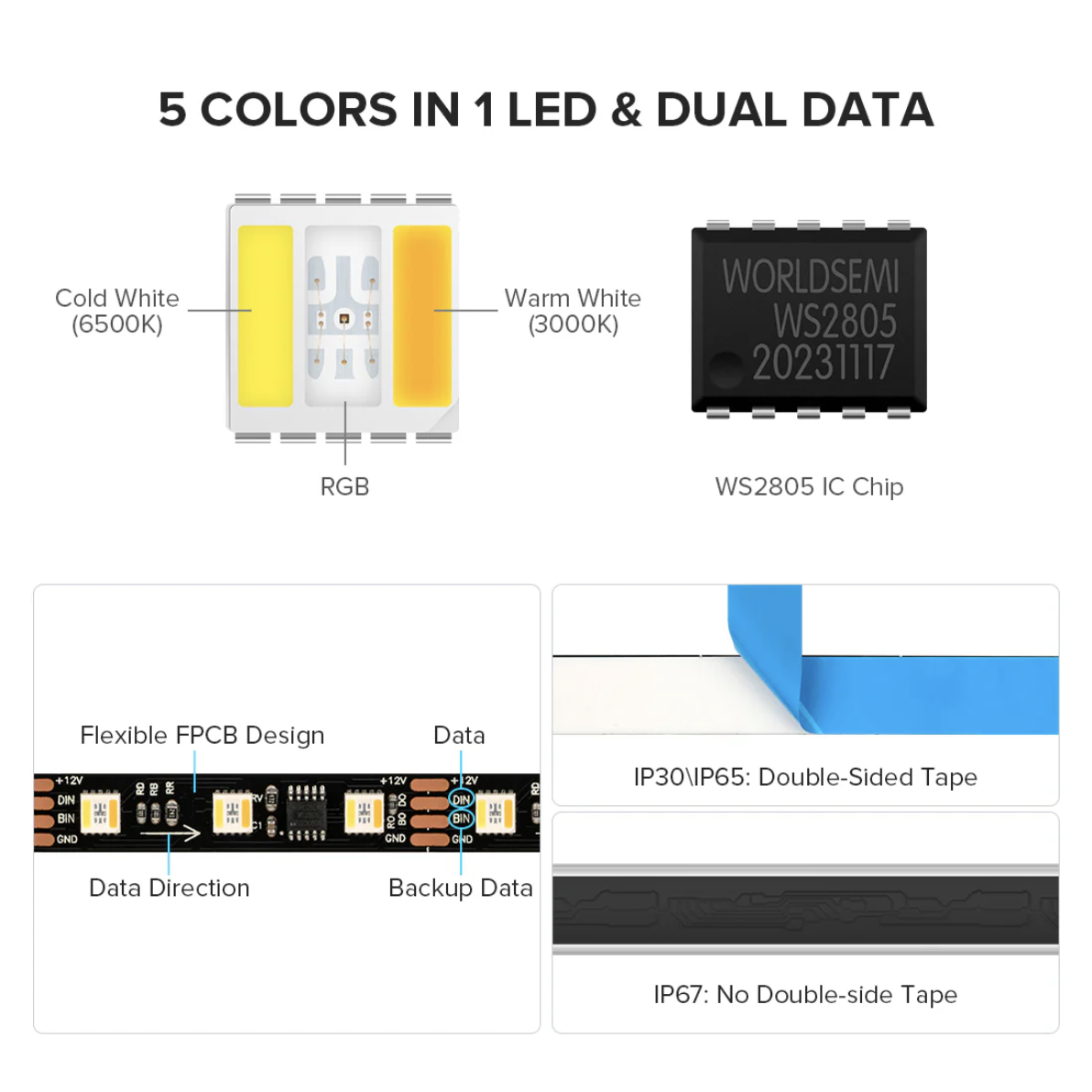 Verpakking bevat: 1 x 5m WS2805 Pixels RGBCCT 60leds/m LED-strip.