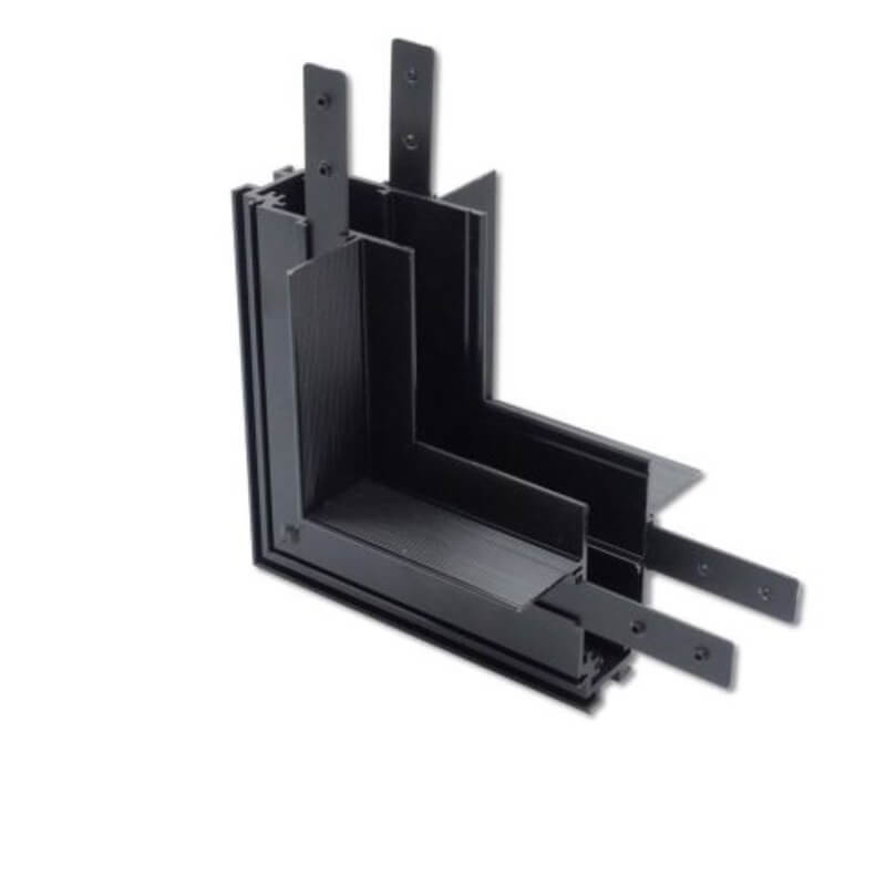 Verticale hoeken zorgen voor een strakke plafond-wand overgang in één lichtlijn; aansluitstukken (NC) geven geen stroom door en vereisen een losse, weg te werken connector.